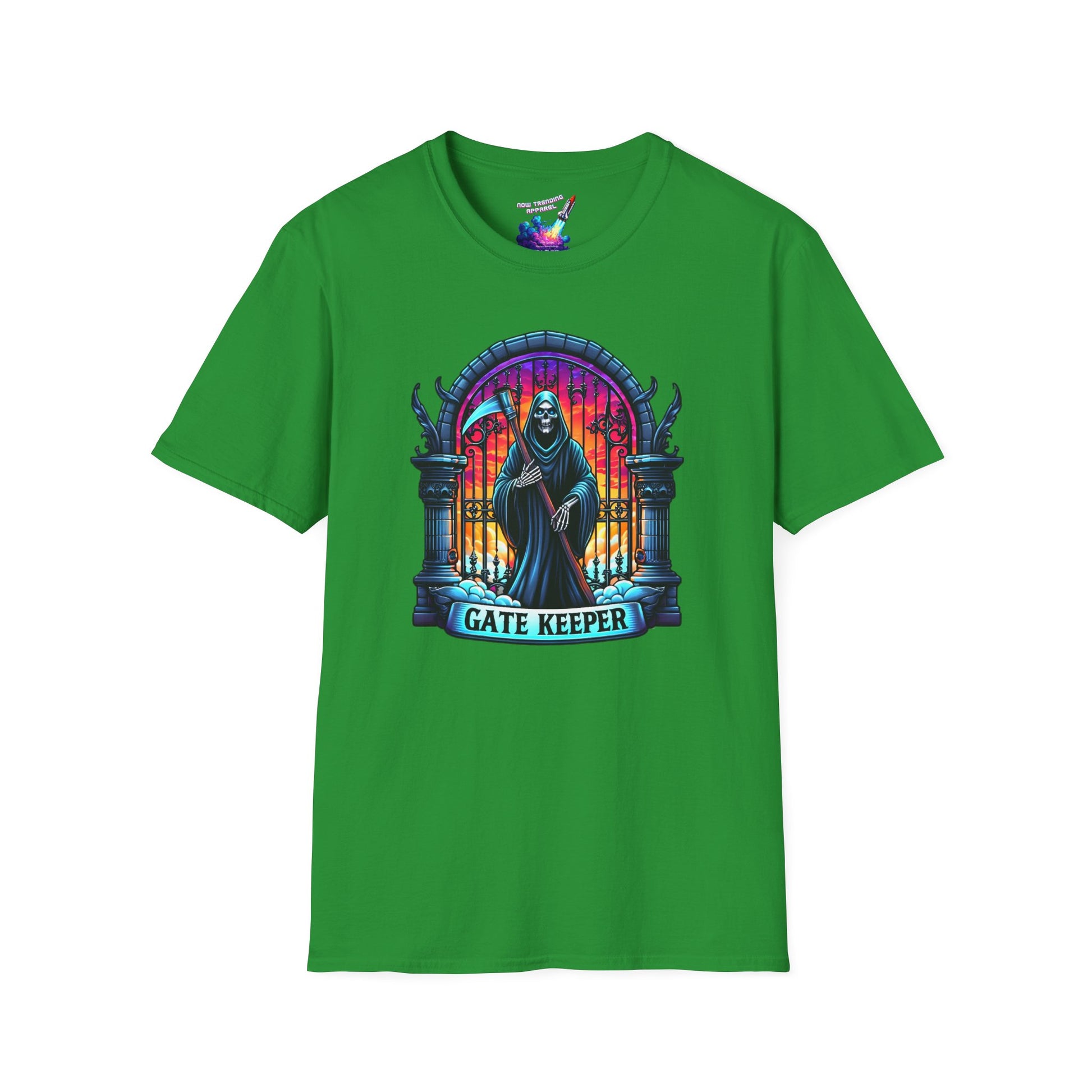 The flex is sacred and the gates are locked. The 'Gate Keeper' Unisex Graphic T-Shirt is for the ones who know the best-kept secrets—and refuse to spill them. You’re the friend who “forgets” the name of the hole-in-the-wall taco spot, the one who dodges DMs asking “where’d you get that shirt,” and the curator of playlists so good they should be password-protected. You don’t just keep the vibe—you guard it like the Grim Reaper at the pearly gates. The design is bold, ironic, and dripping with meme-worthy menace. It’s giving “you’re not on the list”and "no, I won't send you the link." So slip it on and be the keeper of all things cool, deciding who gets access to your taste and who stays outside the velvet ropes. Whether it’s food, fashion, or the next viral trend, this tee makes sure you’re the one holding the scythe and the secrets. Get yours today!! (Just don't gate keep where you got this tee!)